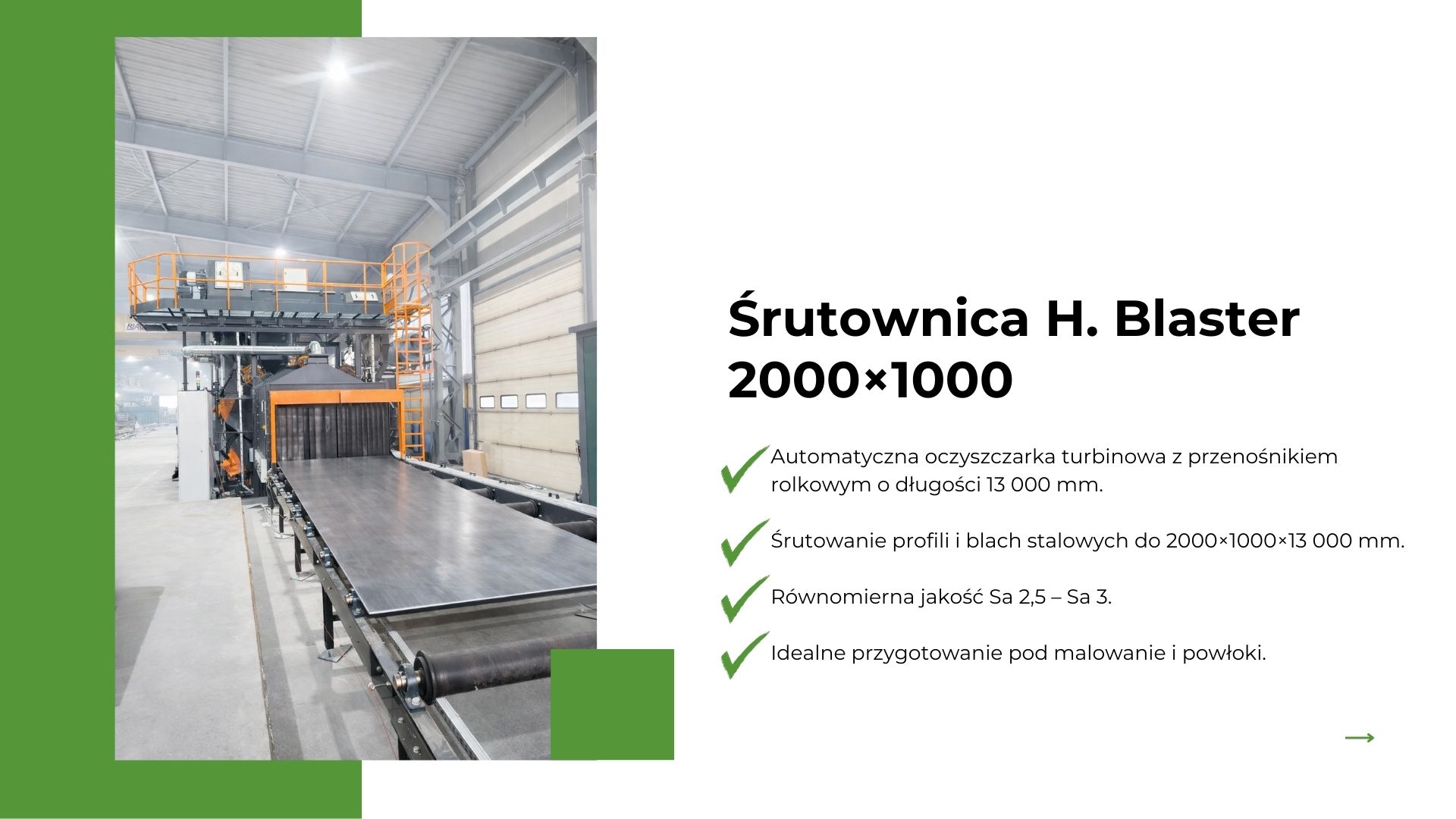Uzupełnieniem naszej oferty jest automatyczna oczyszczarka turbinowa H. Blaster 2000×1000, wyposażona w poziomy przenośnik rolkowy o długości 13 000 mm. Urządzenie przeznaczone jest do wydajnego, przelotowego śrutowania blach i profili stalowych, zapewniając jednolitą jakość oczyszczania na całej powierzchni elementu.