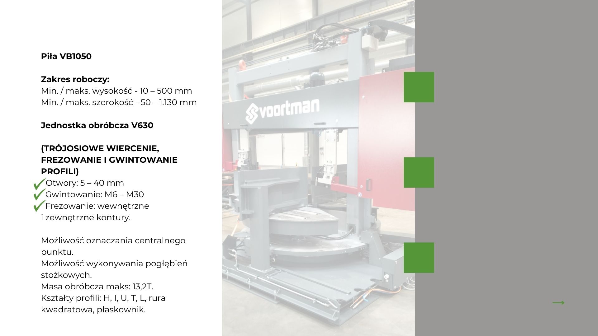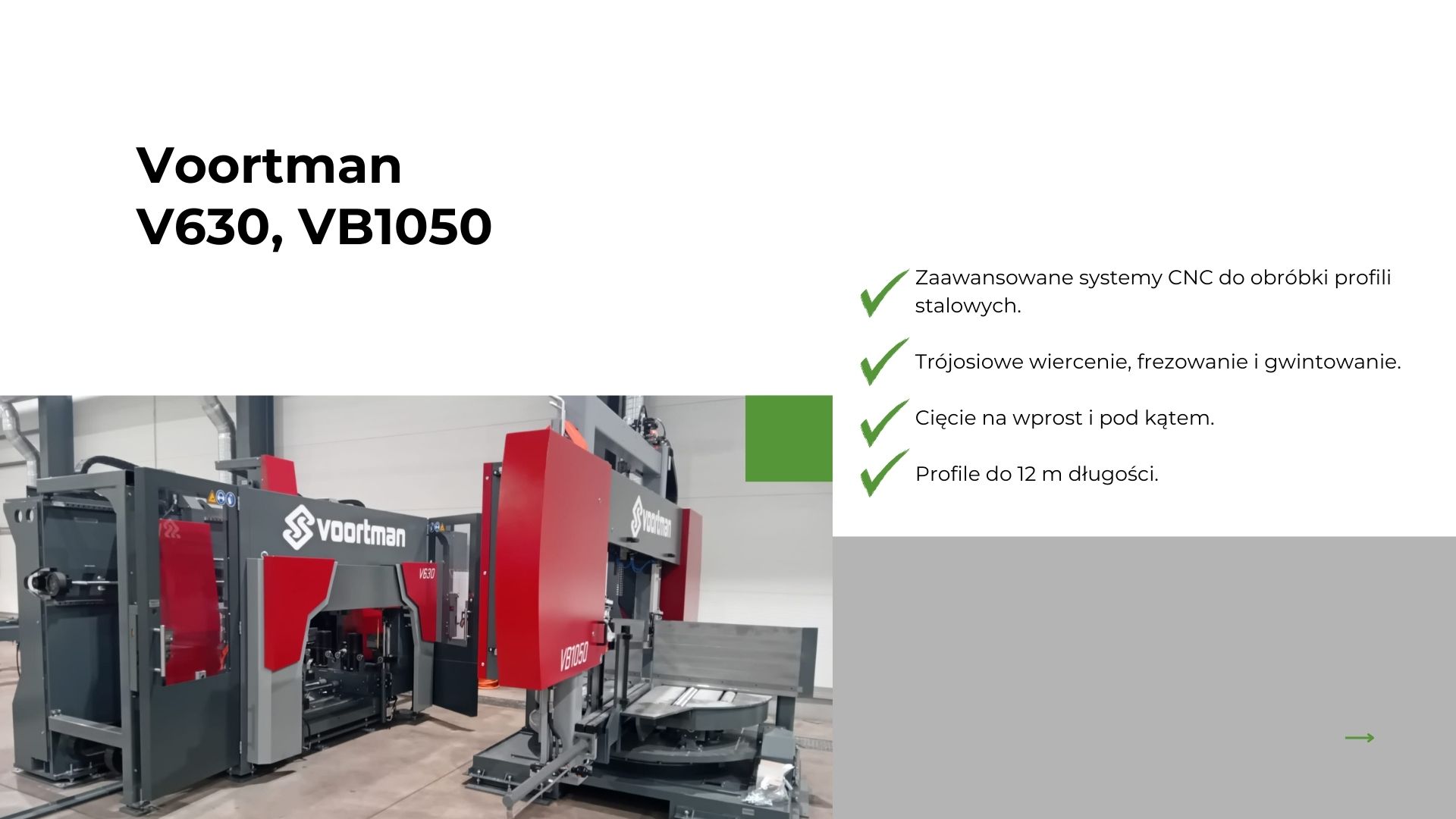 W ramach naszych usług realizujemy wiercenie trójosiowe oraz cięcie profili stalowych na wprost i pod kątem z wykorzystaniem zaawansowanych systemów CNC Voortman V630 oraz VB1050. To rozwiązania stworzone z myślą o wysokiej dokładności, powtarzalności i wydajności – zarówno w produkcji seryjnej, jak i jednostkowej.